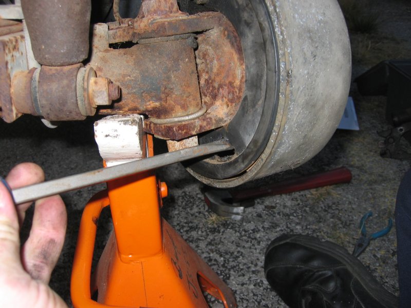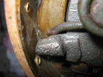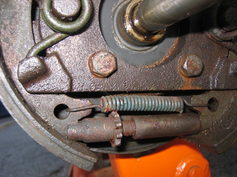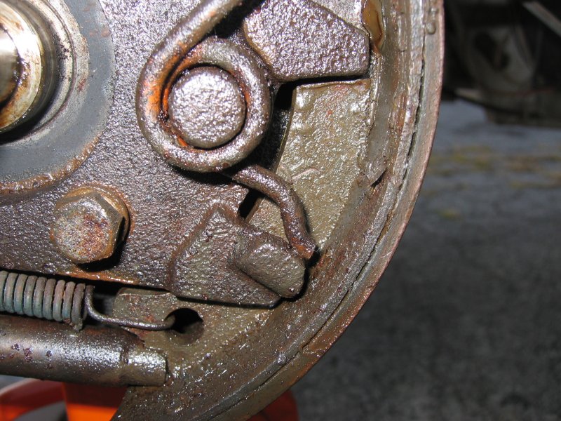 | Turning the Adjuster | The front assembly "as-found" Note carefully the placement of the shoe retractor hairpin springs. Note that the left and right springs are slightly different. Don't mix them up. | |||||||||||||||||