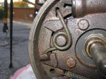 Step 1: Remove the wheel and drum. Back off the adjuster if necessary to let the drum release. The adjuster is a toothed wheel (see below) that can be turned with a screwdriver after removing the rubber access plug. The drum may be stuck to the axle if the assembly is rusted. DO NOT try to pry between the backing plate and the drum! The plate is plastic and will break. First try tapping the rear of the drum with a soft face (brass) hammer. If that fails then a 3 jaw gear puller can be carefully used. Do not force things, as the drum is easily warped and replacements are hard to come by. Heating the hub around the studs might also help. If all else fails, pop the grease cap, remove the bearing retainer nut and remove the hub and drum as an assembly. |