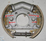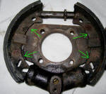 The most important thing I've learned is that the indian-made spiders are junk. Apparently tolerance and finish and finish are new concepts to the indians. The lack of finish or control of dimensions resulted in one wheel that would lock up solid whenever any amount of brake pressure was applied. It would stay locked up until the vehicle was allowed to roll backward. After taking the wheel and brake drum off several times, I decided to pull the whole brake assembly off, take it back to the shop and look things over in an orderly manner. One thing quickly became evident - again - and that is, NEVER THROW AWAY OLD PARTS. At least until you're absolutely positively sure that the new parts work OK. The basic problem I found was that the critical shoe back-seating radius on the spider AND the length of the guide tangs were so far off that the shoes were jacked up such that whenever brake pressure was applied, the shoe wedged between the drum and the cylinder and locked the wheel. The solution was to machine the spider to more suitable dimensions. The old OEM spider provided known-good dimensions. Ideally the spider would be chucked up in a lathe and the important radii turned to perfection. Lacking such luxuries, I substituted the next best thing - an angle grinder, a wheel of suitable width and a stable hand. |