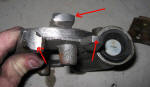 This photo shows the old spider on the left vs the new spider on the right. Note the various arrows. Note how sloppy the radius where the shoes mate is. Note how the guide prongs hold the shoes off the seating radius. Note the general sloppiness. | |||||||