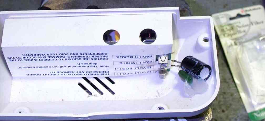 Unfortunately it had a couple of problems that were quite annoying. The first problem is that the thermostat cycles too rapidly. There is too little deadband in the electronic controls. Under the right conditions it can cycle every 4 or 5 minutes. Quite annoying when you're trying to sleep. Maxxair will provide a replacement control board if you ask but it's much more fun to solve the problem yourself. The second problem is that the Pulse Width Modulation (PWM) speed control emits a lot of electrical interference (EMI). In particular, it greatly affected my E-meter, making its readings erratic and pretty useless. This page documents my solutions to both of the problems. |